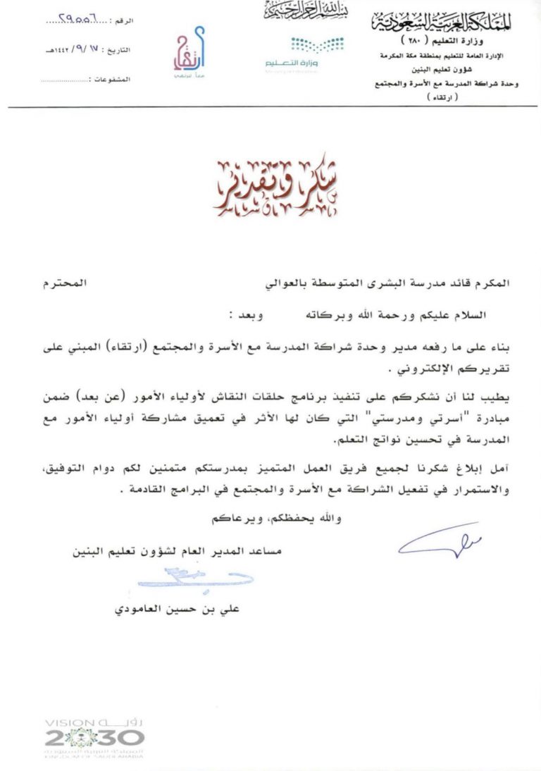 بعث مساعد المدير العام لشؤون تعليم البنين خطاب شكر و تقدير لفريق العمل بالمدرسة الذين ساهموا بتنفيذ برنامج حلقات النقاش لأولياء الأمور ضمن مبادرة “أسرتي مدرستي” و التي كان لها الأثر في تحسين نواتج التعلم.
