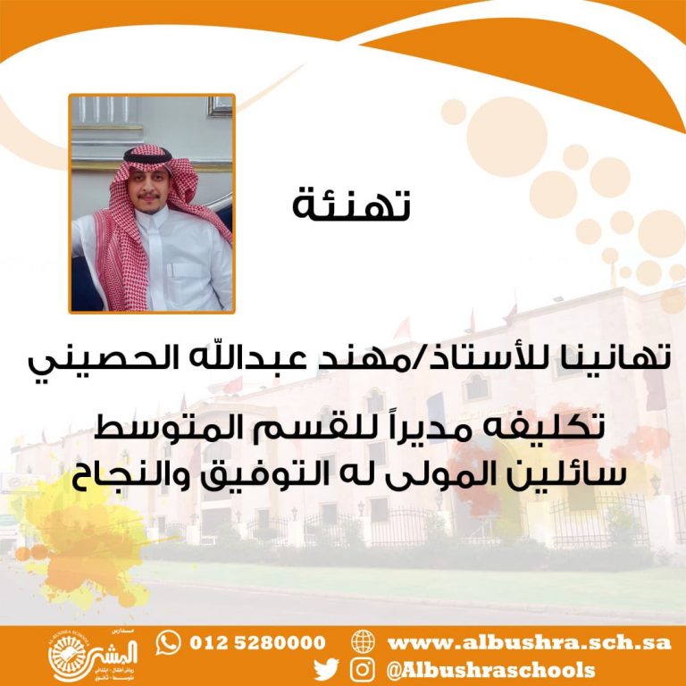 ويسعدنا أن نتقدم بتهنئة الأستاذ / مهند بن عبدالله الحصيني على تكليفه مديراً للمدرسة سائلين المولى له التوفيق والسداد والعون وأن تستمر تحت إدارته مسيرة التميز.