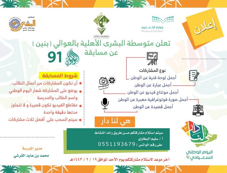 أقامت إدارة المدرسة حفلاً بمناسبة #اليوم_الوطني_السعودي_91 تحت شعار #هي_لنا_دار وقد إحتوى الحفل على العديد من الفقرات المتنوعة وفي نهاية الحفل قُدمت الجوائز للطلاب الفائزين بمسابقة اليوم الوطني والمشاركين في الحفل.