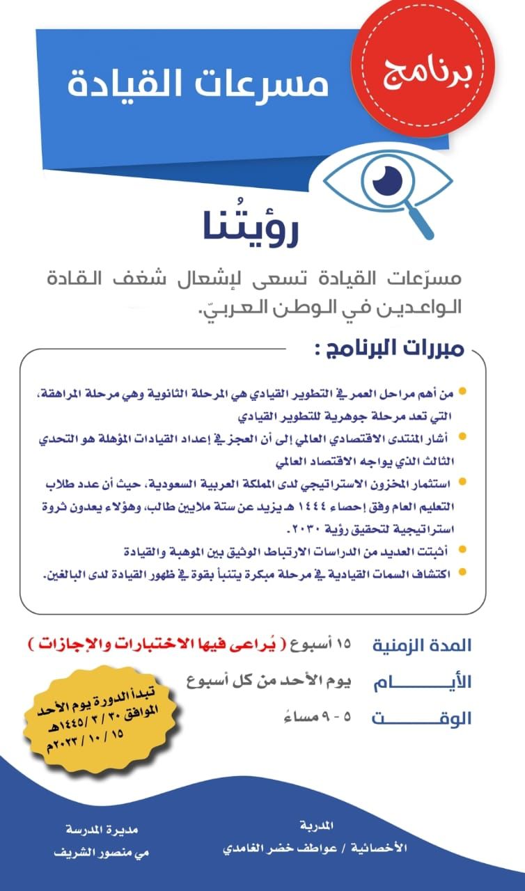 ضمن البرامج التطويرية التي تقدمه المدرسة للطالبات انطلق برنامج مسرعات القيادة يوم الاحد الموافق 1445/3/30والمستمر لمدة 15 اسبوع يهدف لاكتشاف السمات القيادية للطالبات وتطويرها مع…