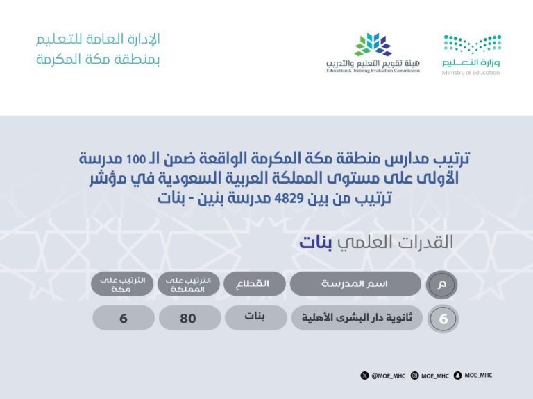 حصدت ثانوية دار البشرى الأهلية قسم البنات المركز السادس في القدرات العلمي على مستوى المملكة العربية السعودية
