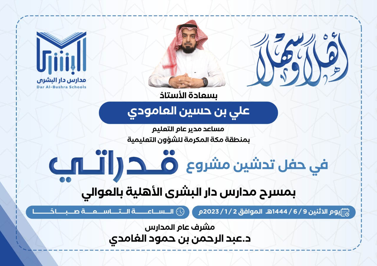 في يوم الاثنين الموافق 2 / 1 / 2023 دشن سعادة مساعد مدير عام التعليم بالعاصمة المقدسة الاستاذ علي بن حسين العمودي مشروع (قدراتي) بمسرح…