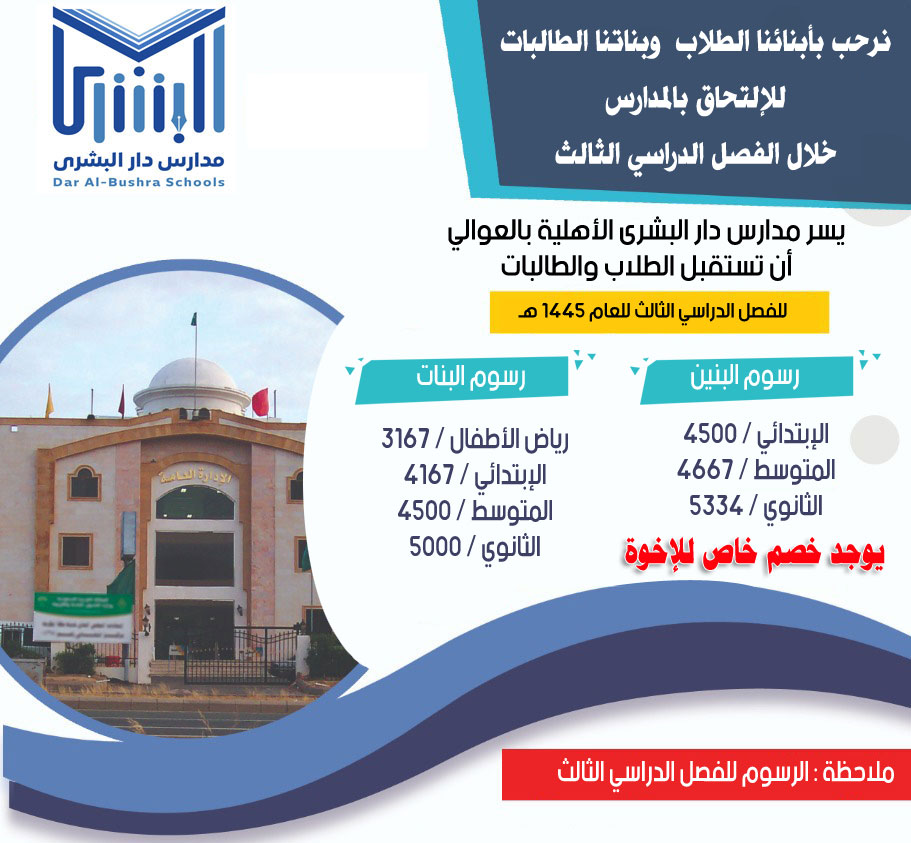 مدارس دار البشرى بالعوالي ترحب بأبنائنا الطلاب وبناتنا الطالباتللاتحاق والتسجيل بالفصل الدراسي الثالث