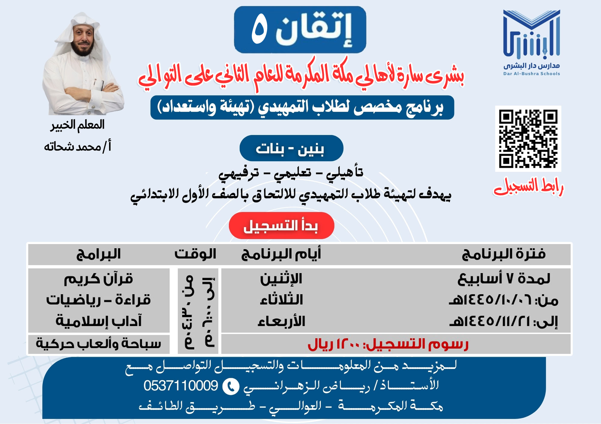 للعام الثاني على التوالي تعلن مدرسة دار البشرى الابتدائية الأهلية بالعوالي عن بدء التسجيل في برنامج إتقان في مرحلته الخامسة والمخصص لطلاب التمهيدي للالتحاق بالصف…