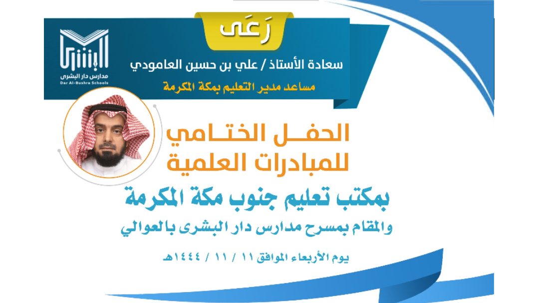 برعاية مساعد مدير التعليم بمكة المكرمة الاستاذ /علي بن حسين العامودي الحفل الختامي للمبادرات العلمية بمكتب تعليم جنوب مكة والمقام بمسرح مدارس دار البشرى