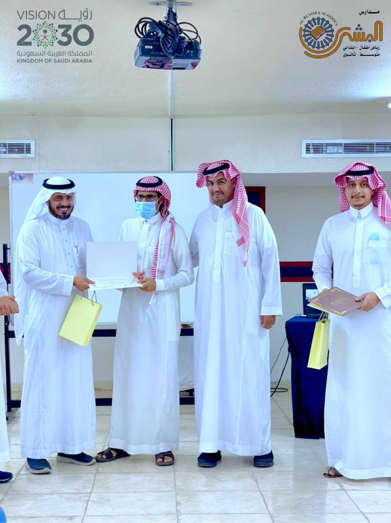 برعاية المشرف العام بالمدارس: الدكتور/ عبدالرحمن بن حمود الغامدي كرم مدير المدرسة: الأستاذ/ محمد بن عابد القرشي المعلمين الذين أشرفوا على تدريب طلابنا الفائزين في مسابقة العالم الصغير