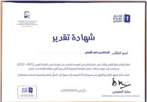 شهادة شكر وتقدير للأستاذ / سليم البطاوي مقدمة من مدير مكتب مبادرات محمد بن راشد آل مكتوم العالمية على الجهود الاستثنائية في مبادرة تحدي القراءة العربي