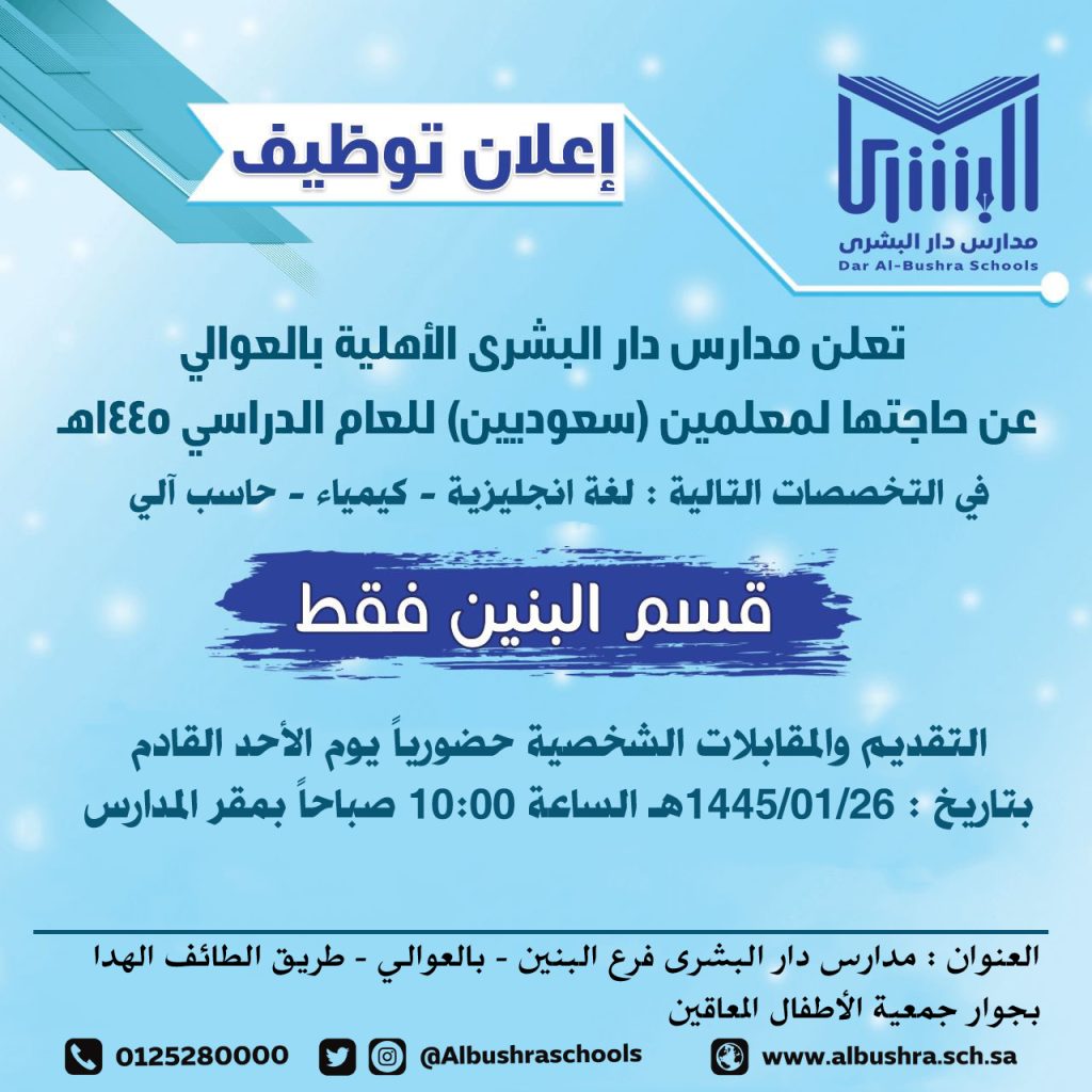 اعلان توظيف ماجد باحاذق│ 9 أغسطس، 2023│ عام ☑ المزيد من أخبارنا مهرجان عالمي الجميل الملتقى الاول للامهات استلام الزي المدرسي استقبال الاطفال للعام الجديد 1446