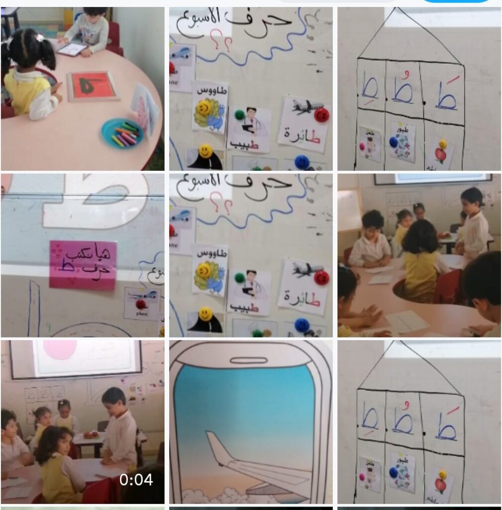 كان الدرس عبارة عن رحلة تخيلية بطائرة ثم تعريف الأطفال بصوت الحرف وشكله وطريقة كتابته