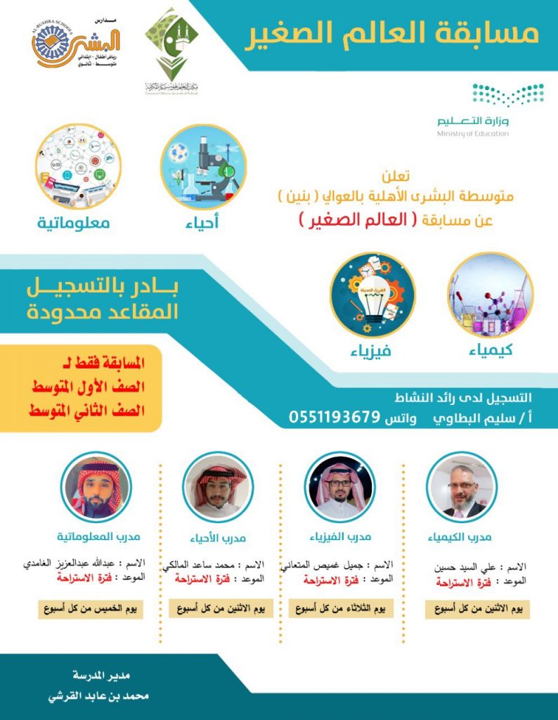 تم إطلاق مسابقة ( العالم الصغير ) و فتح باب التسجيل للمسابقة في إحدى المجالات التالية: ( أحياء – كيمياء – فيزياء – معلوماتية ) و التدريب مع نخبة من الأساتذة المتميزين تحت إشراف قسم النشاط الطلابي بالمدرسة