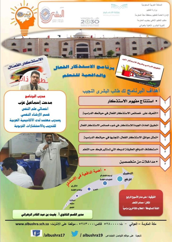 برعاية سعادة الأستاذ: مبارك عبد الكريم الزهراني (وكيل شؤون المعلمين بالمدرسة)، بدأت اليوم فعاليات برنامج الاستذكار الفعال والدافعية للتعلم حيث قام الأستاذ مدحت إسماعيل عزب (الموجه الطلابي) بتدريب الطلاب علي خصائص وأساليب الاستذكار الفعال من خلال ورش واوراق عمل ونشرات للطلاب.